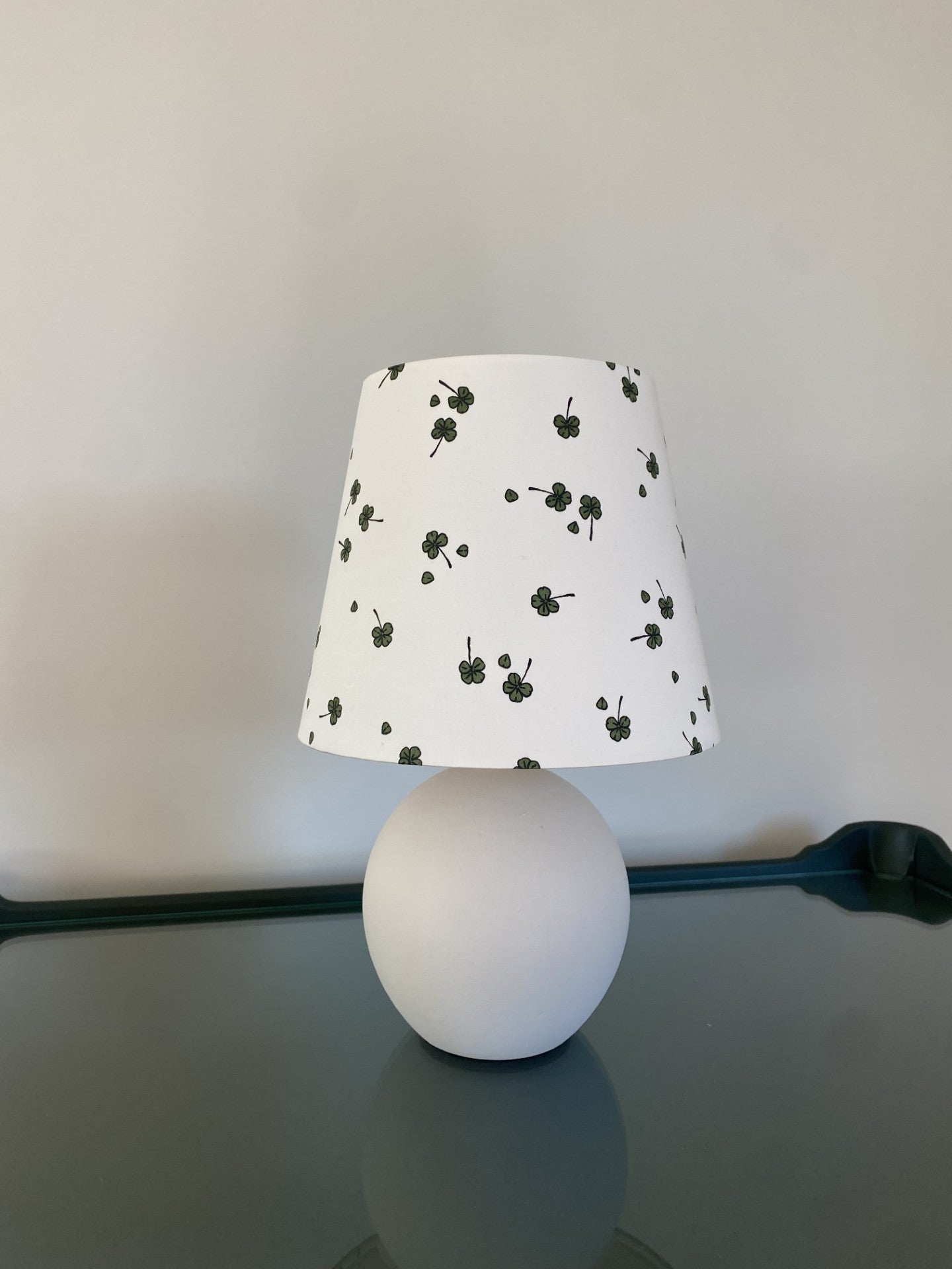Meget fin lampeskærm i tekstil med vores klasisske kløver print. Der er lampeskærm og låg. Den har pæreklemme som man blot sætter på pæren.